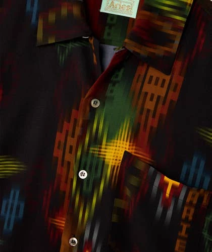 Camiseta de manga corta de Aries Arise inspirados en la escena rave de los años 90 con estampado ikat caleidoscópico, cierre de botones y bolsillo de parche.