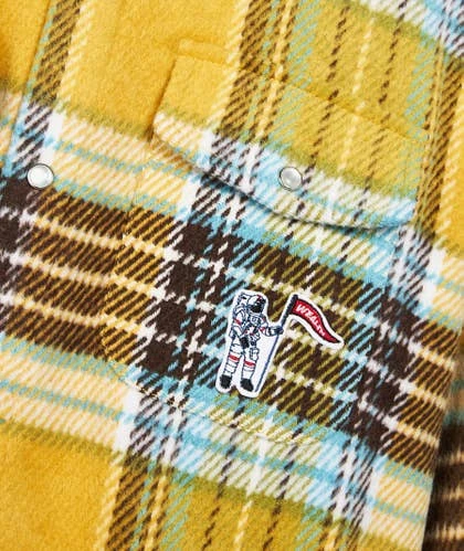 Esta camisa de cuadros amarilla forma parte de la colección Otoño 21 de Billionaire Boys Club. Esta prenda de franela de peso medio presenta un parche de astronauta de pie bordado en el pecho y un cierre de tapeta con botones de presión.