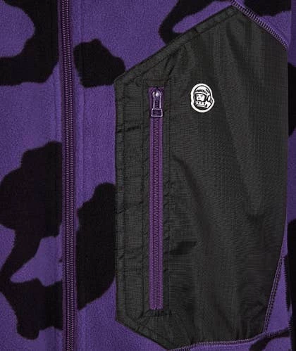 Esta chaqueta lila de forro polar con cremallera forma parte de la colección de otoño 2021 de Billionaire Boys Club. Cuenta con 3 bolsillos delanteros con cremallera, un logotipo de goma de casco de astronauta en el pecho, un texto bordado en el cuello y un estampado de leopardo.
