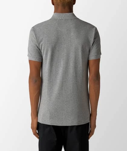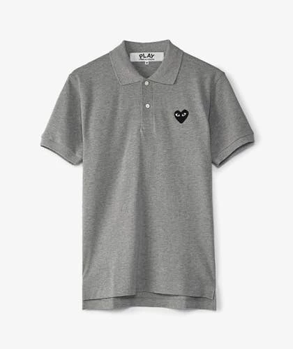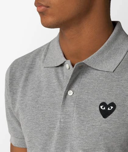 Polo de manga corta de CdG Play, con cuello y puños de canalé. La prenda gris presenta un cierre de botones y se distingue por el corazón bordado en el pecho.