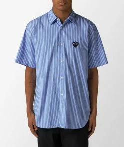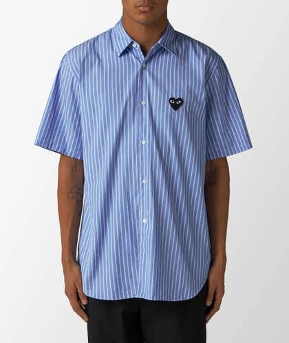 Camisa de rayas de CdG Play, en azul claro y blanco. La prenda de manga corta presenta un cuello camisero y cierre de botones, y se distingue por el corazón bordado en el pecho.