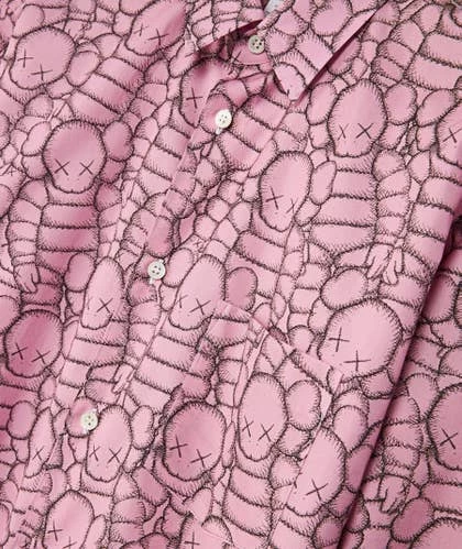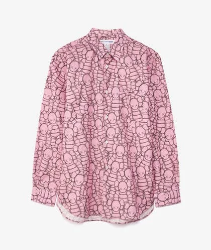 Camisa rosa de algodón con alloverprint inspirado en la obra artística de KAWS. La prenda forma farte de la colaboración del artista neoyorkino con Comme des Garçons Shirt.