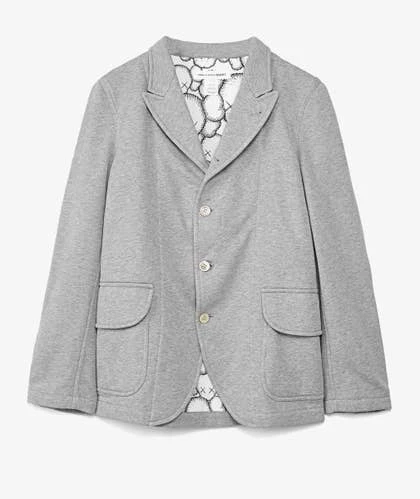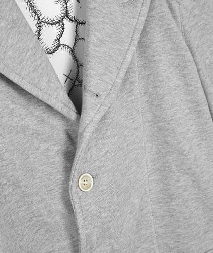 Americana de punto de algodón en color gris con amplios bolsillos con tapeta en los laterales de Comme des Garçons x KAWS. La prenda destaca por su forro interior con estampado allover inspirado en las míticas figuras del artista neoyorkino.