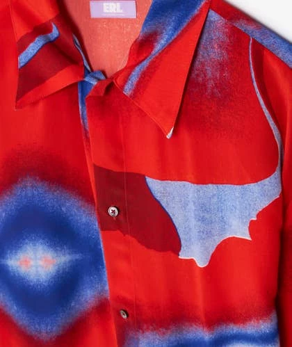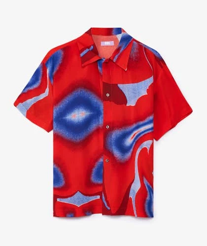 Camisa de manga corta de ERL con diseño integral biomórfico rojo y azul, cierre de botones y dobladillo recto.