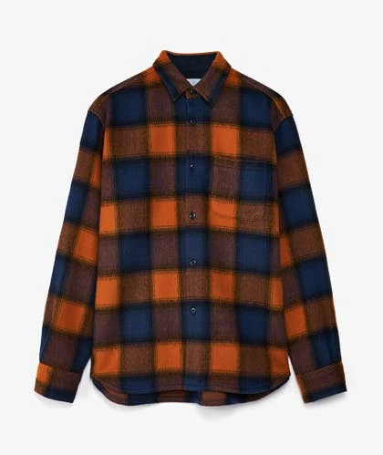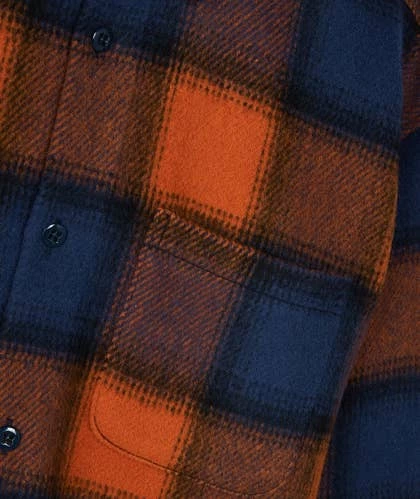 Camisa de manga larga de la temporada FW21 de Hombre Niño confeccionada con un tejido pesado de mezcla de lana con estampado de cuadros en diferentes colores. Incluye un bolsillo de parche en el lado izquierdo del pecho.