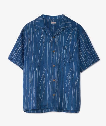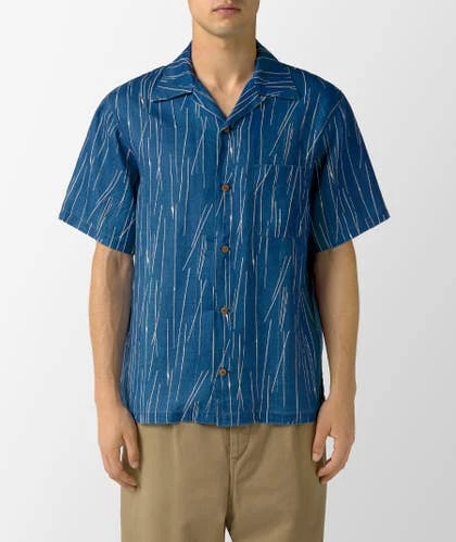 Esta camisa estampada de KAPITAL está confeccionada con un lino fresco, el cual fue teñido de manera artesanal con índigo natural. Presenta un patrón de líneas finas en toda su superficie y un bolsillo funcional en la parte frontal.