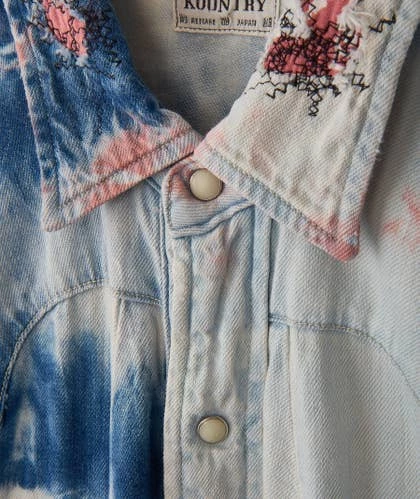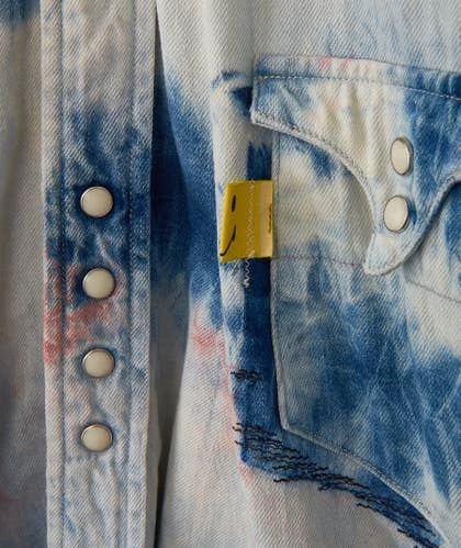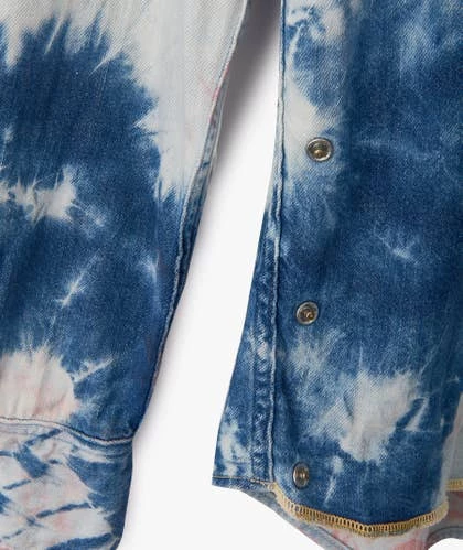 Teñida con un patrón tie-dye bicolor y detallada con múltiples costuras artesanales.