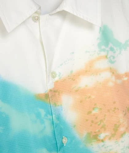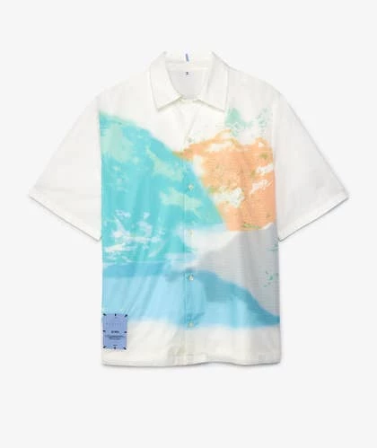 Esta camisa de manga corta con estampado pixelado tipo tie-dye forma parte de Breathe, el Icon N.º7 de MCQ, una colección permanente de prendas esenciales desarrollada con materiales sostenibles, tonos neutros y elementos funcionales.