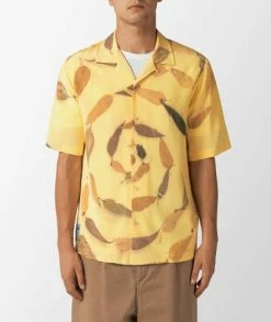 Camisa de seda de la colección Biosis de MCQ con estampado all-over de hojas otoñales, cierre de botones y etiqueta de la marca en la parte inferior.