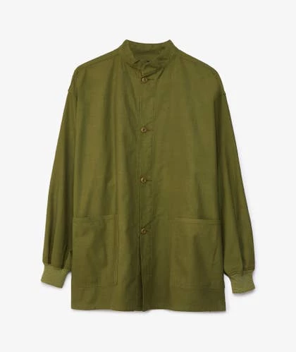 Camisa verde caqui de manga larga de Needles con cuello Mao, bolsillos laterales, cierre de botones y puños elásticos y acanalados.