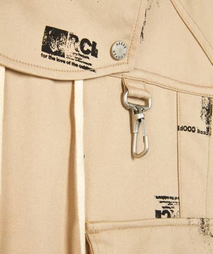 Chaqueta anorak con capucha de la nueva colección de Reese Cooper fabricada en Los Ángeles, California, con una lona resistente de algodón y un ingenioso estampado creado mediante sellos de goma tradicionales. Cuenta con múltiples bolsillos cargo, una solapa protectora en el cuello y el característico parche RCI en la manga. Además, incluye un pistón metálico para portar objetos pequeños.
