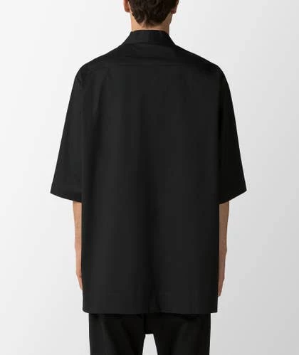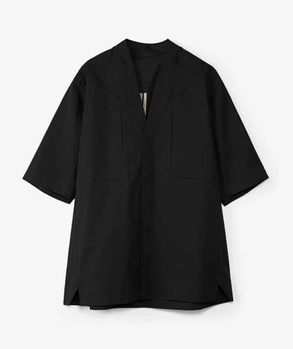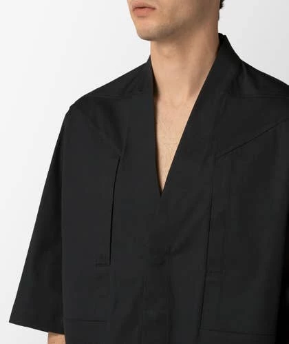 Camisa negra con cuello en V de Rick Owens confeccionada en popelina de algodón GOTS de alto gramaje. Larga hasta la cadera, cuenta con mangas de medio largo, hombros caídos, canesú posterior, cierre con botón automático y dos bolsillos frontales con apertura vertical y botón.