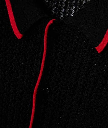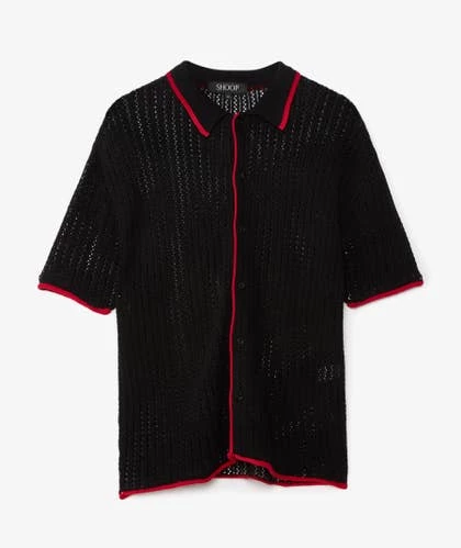 Camisa de ganchillo elástico de SHOOP Clothing, elaborada en preciado algodón Giza. Es de color negro con ribetes acanalados color rojo en el cuello y los dobladillos, y cuenta además con un cierre de botones.