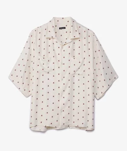 Camiseta blanca oversize de manga corta de Undercoverism. Cuenta con un estampado de rayos, dos bolsillos de parche y un cierre de botones.