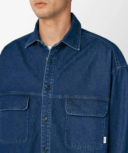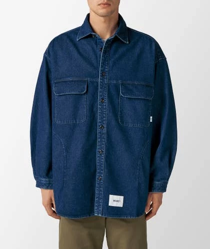 Sobrecamisa de denim de WTAPS. Presenta una silueta holgada, dos bolsillos de parche con solapa, dos bolsillos laterales, bajo redondeado y cierre de botones.